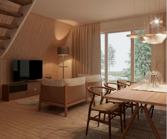 这个公司将传统木结构需要现场切割、剪裁的部分改为工厂进行,并对木结构进行了防腐和美化处理,使得房屋的梁、柱可以十分美观的暴露在外侧的同时,大型的木梁与木柱也使得房间内有大跨度的空间。这种木结构形式和传统结构类似,可以根据业主需求进行定制。