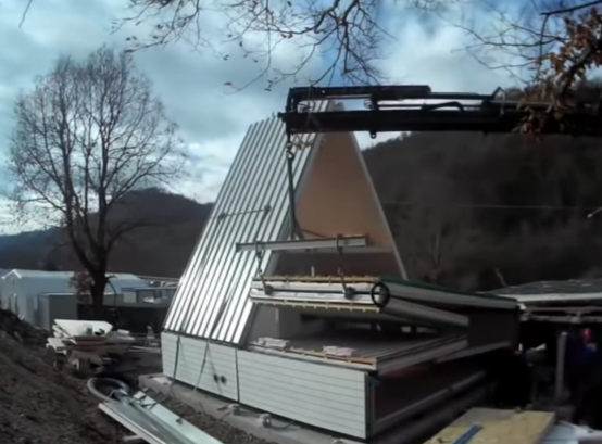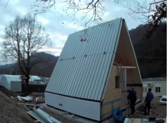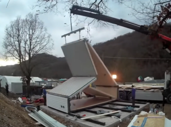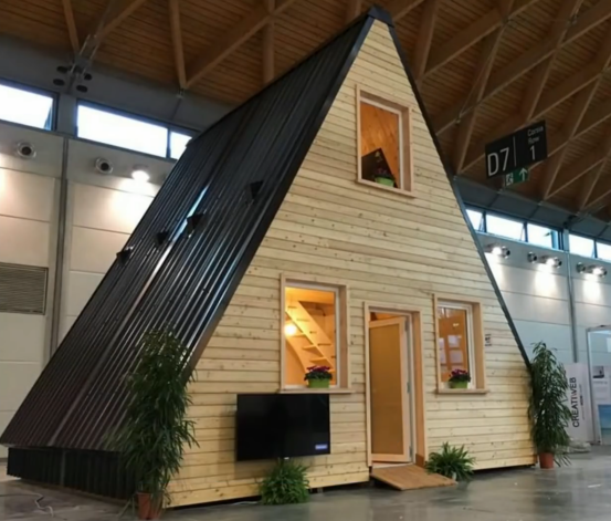 MADI 房屋是一个三角形尺寸偏大的预制化房屋,他的优势是房屋局部采用折叠的安装形式,房屋的所有板件可以拆卸、叠放成一个规整的长方形,十分利于运输。房屋的主体结构为复合彩钢板,可以多模块进行拼接,山墙的围护结构采用木龙骨配套欧松板进行制作。