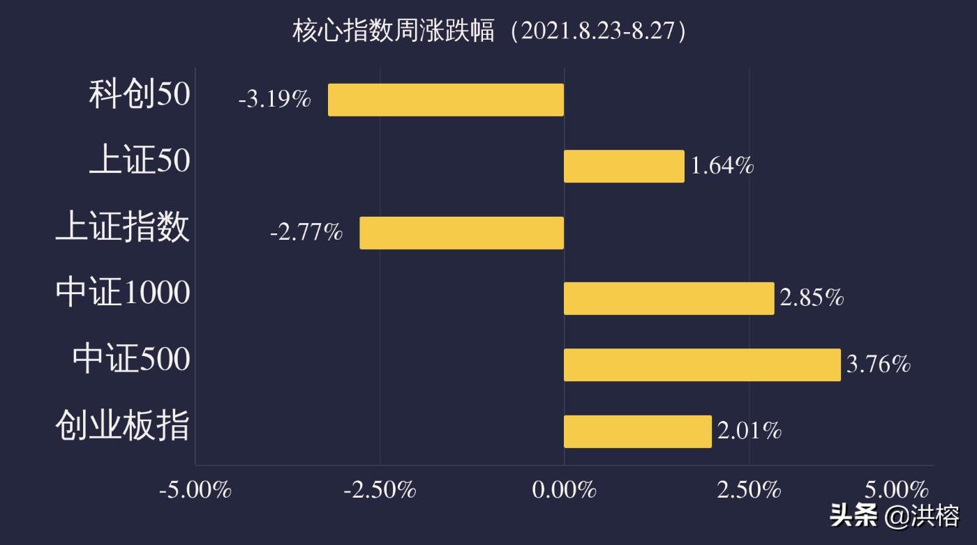 8月第四周,沪指涨幅+3.03%,成交额29969亿元,深成指涨幅-+1.29%,成交额37670亿元,创业板指涨幅+2.01%,成交额15025亿元,科创50涨幅-3.19%,成交额3288亿元。