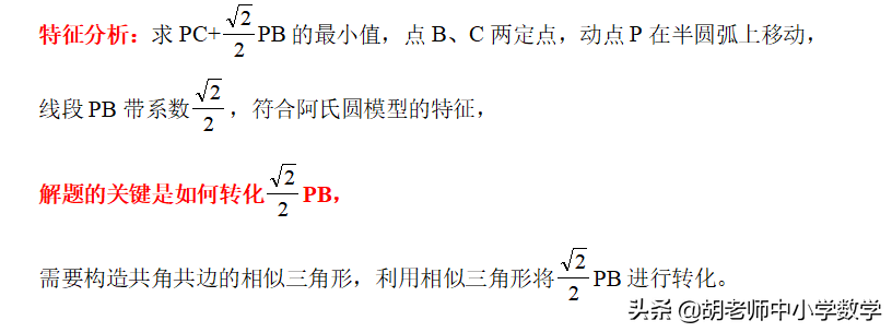 在初中的题目中往往利用逆向思维构造"斜A"型相似(也叫"母子型相似")+两点间线段最短解决带系数两线段之和的最值问题。
