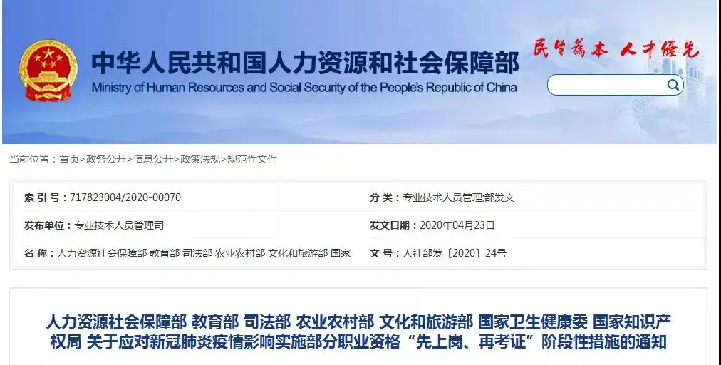 据人力资源社会保障部官网4月23日消息,我国人力资源社会保障部、教育部、司法部、农业农村部、文化和旅游部、国家卫生健康委和国家知识产权局联合印发《关于应对新冠肺炎疫情影响实施部分职业资格“先上岗、再考证”阶段性措施的通知》,其中明确规定对包含专利代理师资格等5项准入类职业资格实施“先上岗、再考证”阶段性措施,凡符合该5项职业资格考试报名条件的高校毕业生,可以先上岗从事相关工作,再参加考试并取得职业资格。用人单位在2020年12月31日前招聘高校毕业生的,不得将取得上述职业资格作为限制性条件。