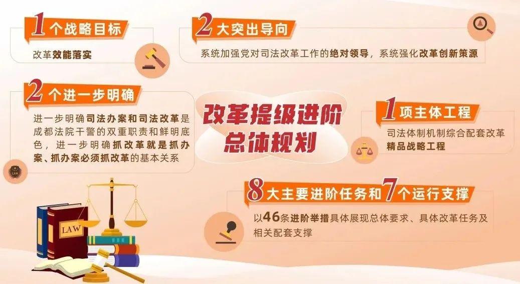 “为进一步发挥改革服务大局、服务群众、服务办案效能,我们结合去年开展的改革评估活动有关情况,起草了《司法体制机制综合配套改革提级进阶的实施意见》。在文件中,我们以‘122187’这几个数字描绘了成都法院司法体制机制综合配套改革未来3—5年的‘路线图’”。