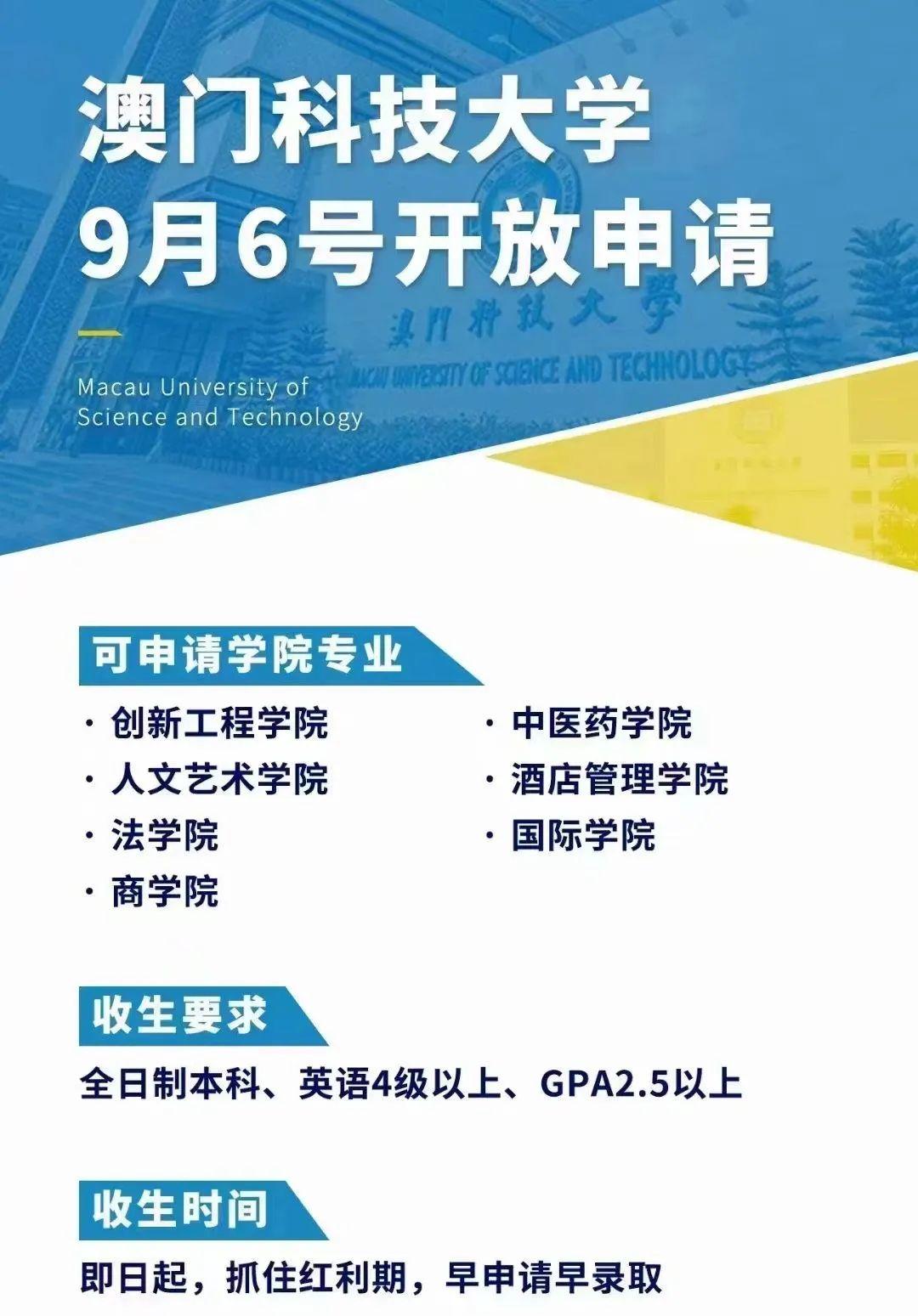 澳门科技大学的硕士课程的录取其实也是“先到先得”的原则,越早申请,就越早得到录取结果。而且,越早申请,硕士/博士学位课程的位置也就越多,申请的成功率就相应的会高一些!