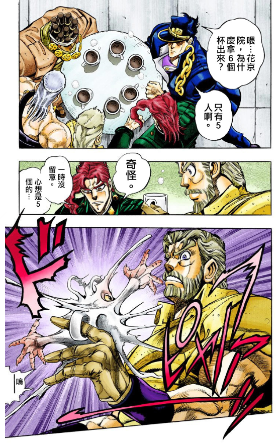 2.“女教皇”具有较强的杀伤力。“女教皇”一开场就变成了一只杯子。当乔斯达拿起这只杯子的时候,“女教皇”直接现身,对乔斯达的手发起了进攻。可以看出它的攻击力不弱,完全可以取人性命。