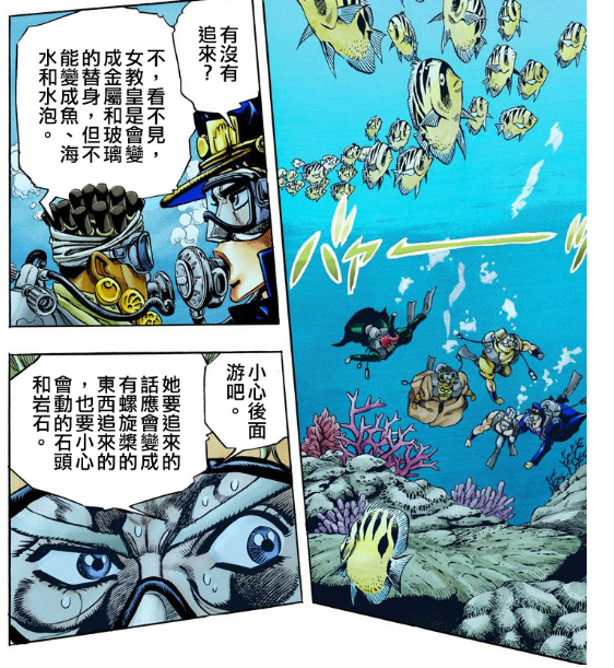 比如“女教皇”在和主角团战斗过程中,还变成了杯子、仪表盘、捕鱼枪、潜水呼气等。连波鲁那雷夫也差点命丧它手。