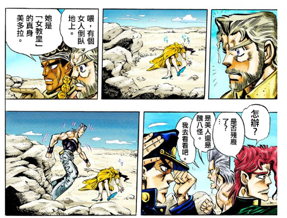 在漫画中,“女教皇”是主角团一行人在搭乘潜水艇前往埃及的途中遇到的,出现在红海一带。它外形看着比较小,只有脸部和双手呈现实体状,身体犹如液体一般,可以根据需要随时液化(这个跟它的能力有关,有点像终结者电影里液体金属人的感觉)。这个液化的特点其实很有用,可以利用这个特点随时改变身体形状和大小,不论是逃跑还是潜藏,都非常有利。