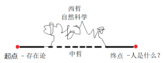 牟宗三(1909-1995)有一个研究方向就是希望把中西哲学融汇贯通。他的主要一项主要工作就是比较中西哲学的异同,希望得出两种哲学文化相通的哲学基础。我对这个问题的看法是,中国哲学从生命体验出发,不太注重中间过程,直达目的,西方现代哲学则主要从理性主义出发,经过复杂的中间过程,演绎推导,最终仍然达到与中国哲学相同的目的,过程如下图。