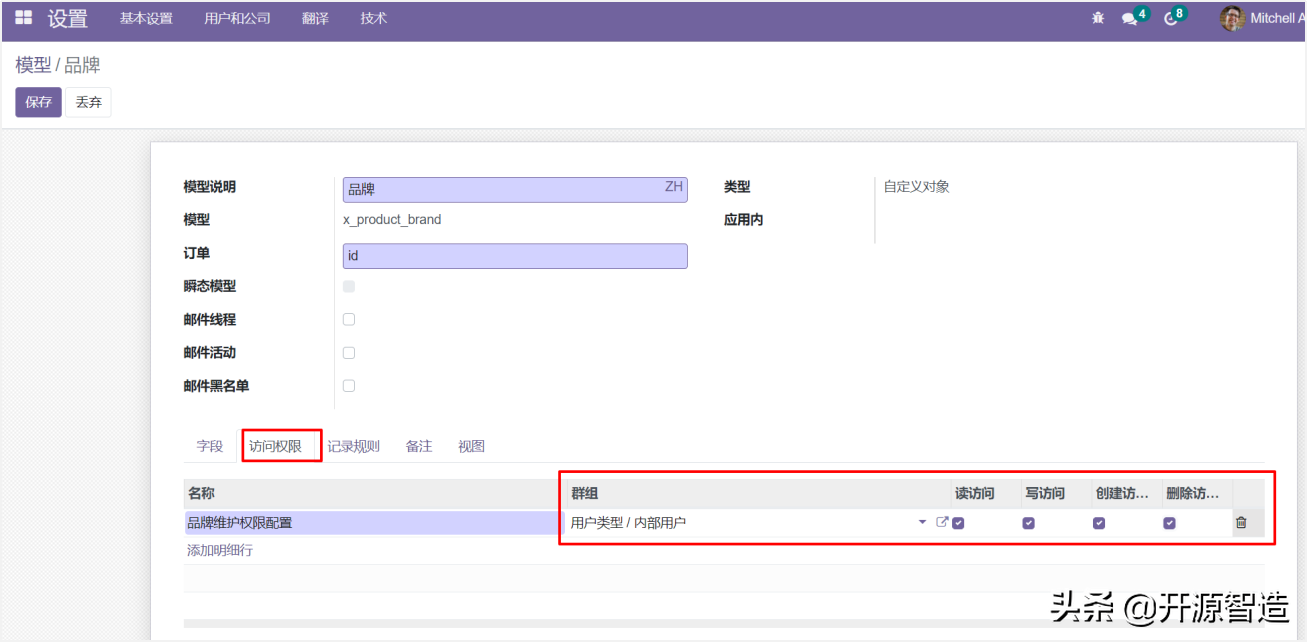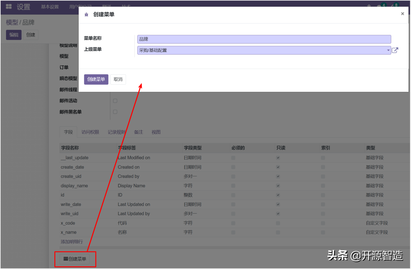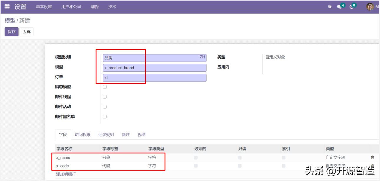 创建新模型 “品牌”x_product_brand 。在Odoo中,在线创建的模型名,以及字段名,必须以 x_ 下划线开头。模型 x_product_brand有两个字段,一个x_name,品牌名称,一个 x_code,品牌代码