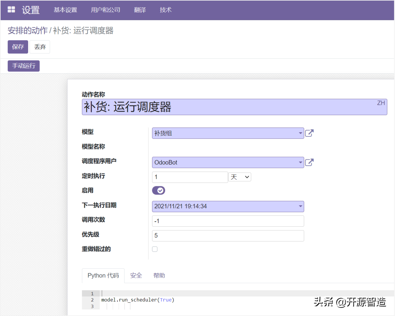 菜单“设置 > 技术 > 自动化 > 安排的动作”,下例截图是Odoo自带的MRP计划运行任务。计划任务上的配置字段较为简单,在前面章节基本都介绍过了,此处不再详述。