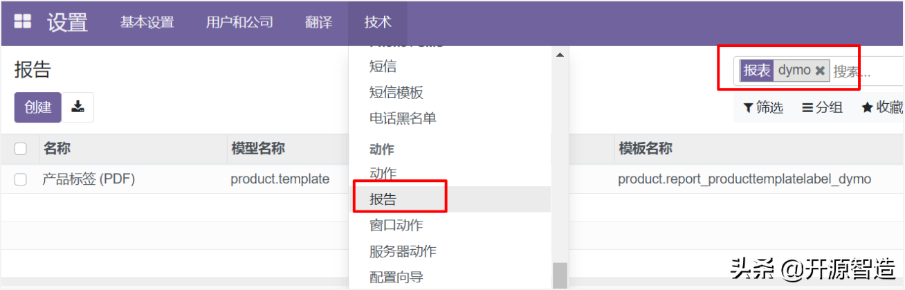 菜单“设置 > 技术 > 动作 > 报告”,搜索dymo报告(产品标签打印的报告)