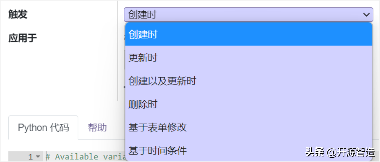 基于表单修改:当在页面上修改指定字段时候,触发自动动作。此选项,在“触发字段”指定哪些字段修改时候触发本动作。和“更新时”不同的是,此选项只有用户在页面上修改字段值时候才会触发,而“更新时”则任何方式的修改(页面上修改,或者程序代码调用 write方法修改)都会触发。