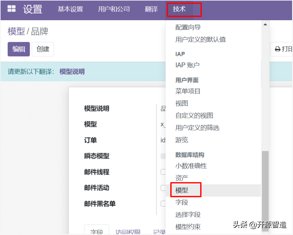 Odoo中,打开开发者模式,进入菜单“设置 > 技术 > 数据库结构 > 模型”