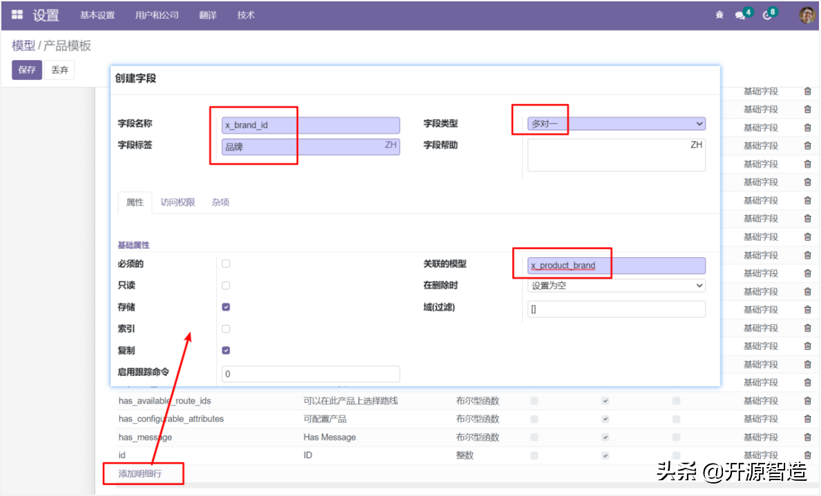 打开“产品模板”模型,点击“添加明细行”,增加字段 x_brand_id , 该字段“多对一”关联到前面创建的表单 x_product_brand ,如下图。添加以后,注意保存字段,以及模型。