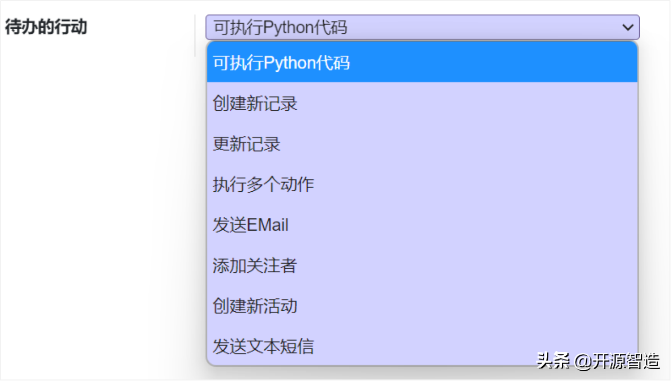 Python代码:当“待办的行动”选择“可执行Python代码”时候,此处编写python程序代码。