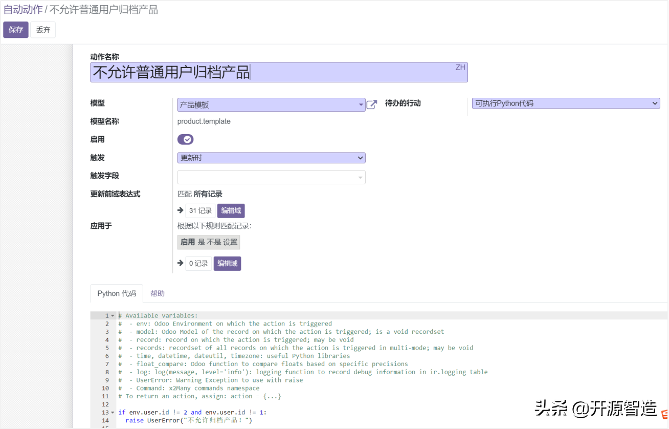 Odoo中在线业务逻辑开发工具有三个,一个是自动动作,一个是服务器动作,一个是计划任务。
