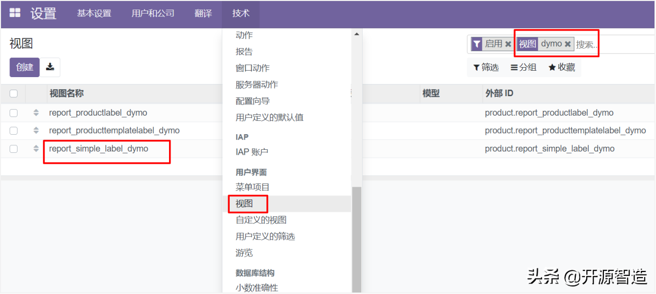 打开菜单“设置 > 技术 > 用户界面 > 视图”,搜索dymo,打开产品标签打印的dymo 视图。
