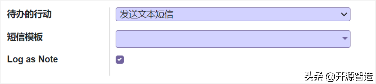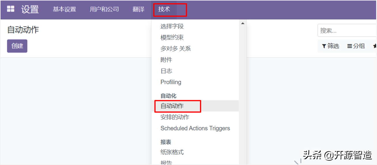 模块安装后,菜单“设置 > 技术 > 自动化 > 自动动作”,创建自动动作。