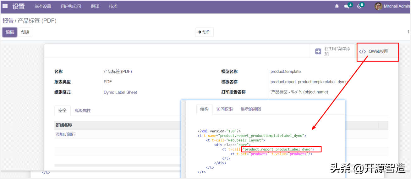 点击打开报告,点击右上角按钮“QWeb视图”,查看打印格式对应的QWeb视图名称
