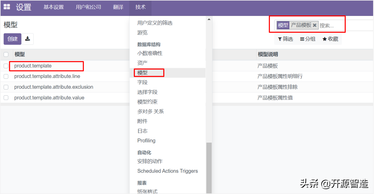 进入菜单“设置 > 技术 > 数据库结构 > 模型”,查找模型“产品模板”,如下图。
