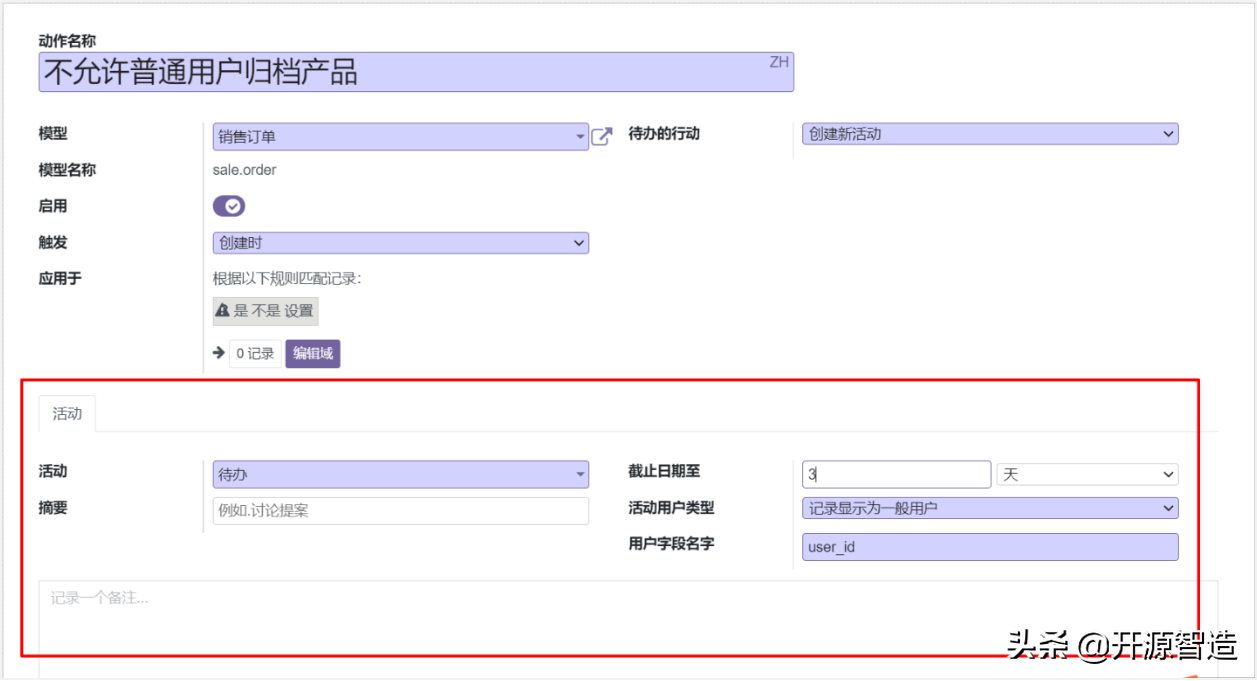 创建新活动:在符合条件的记录上,添加一个待办活动。待办活动可以分配给指定的人,也可以分配给记录上的某个字段指定的那个用户,如下面截图上,待办事项分配给销售订单上的“负责业务员”。