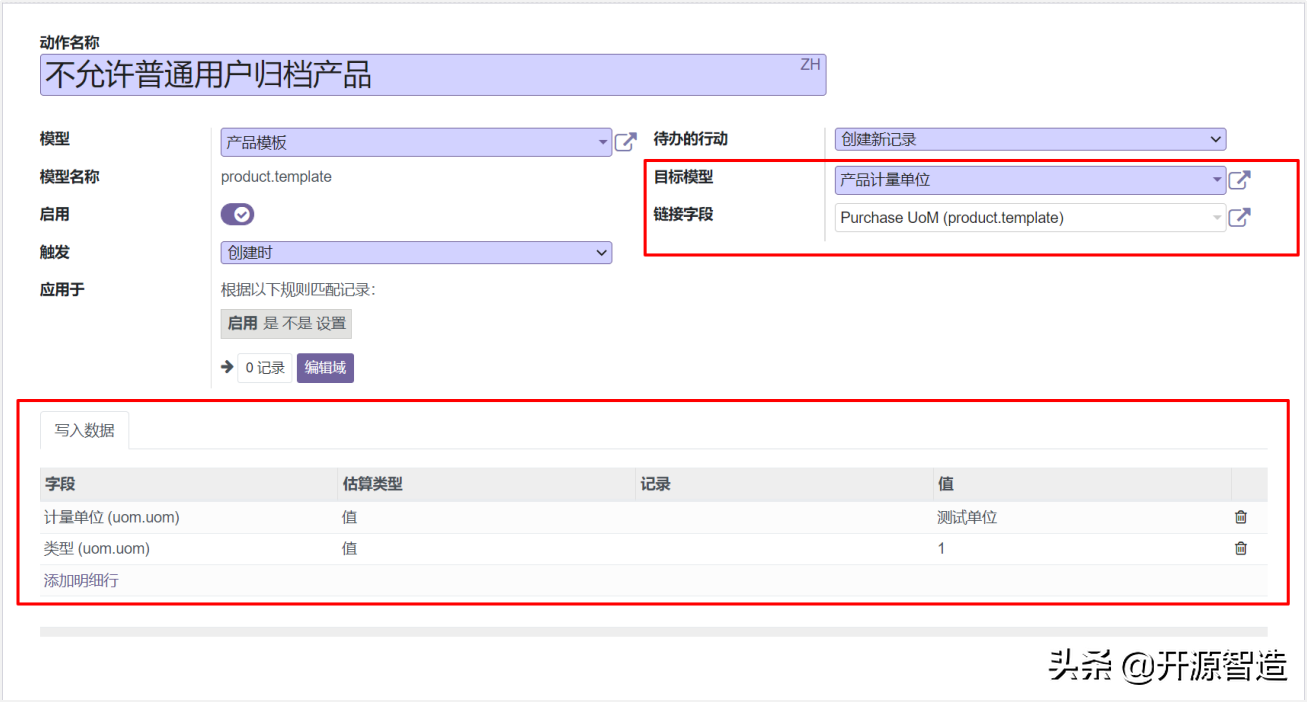 模型:本自动动作适用的模型,如本例是“产品模板”