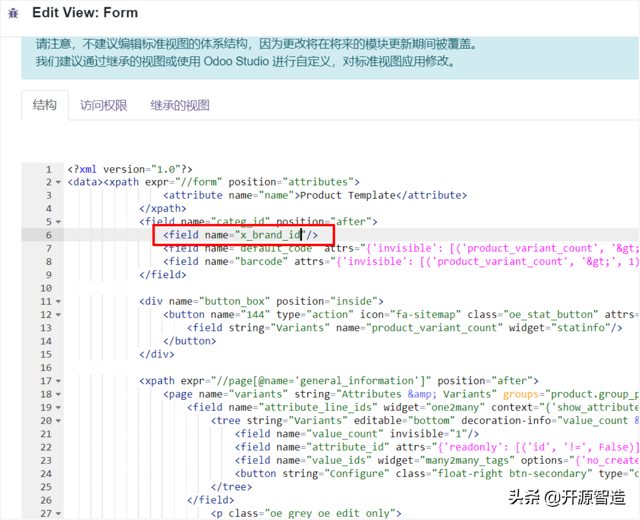 下面图解介绍如何在产品表单上增加品牌字段,该字段关联(数据库术语叫:外键关联,many2one)到前面添加的品牌表单。