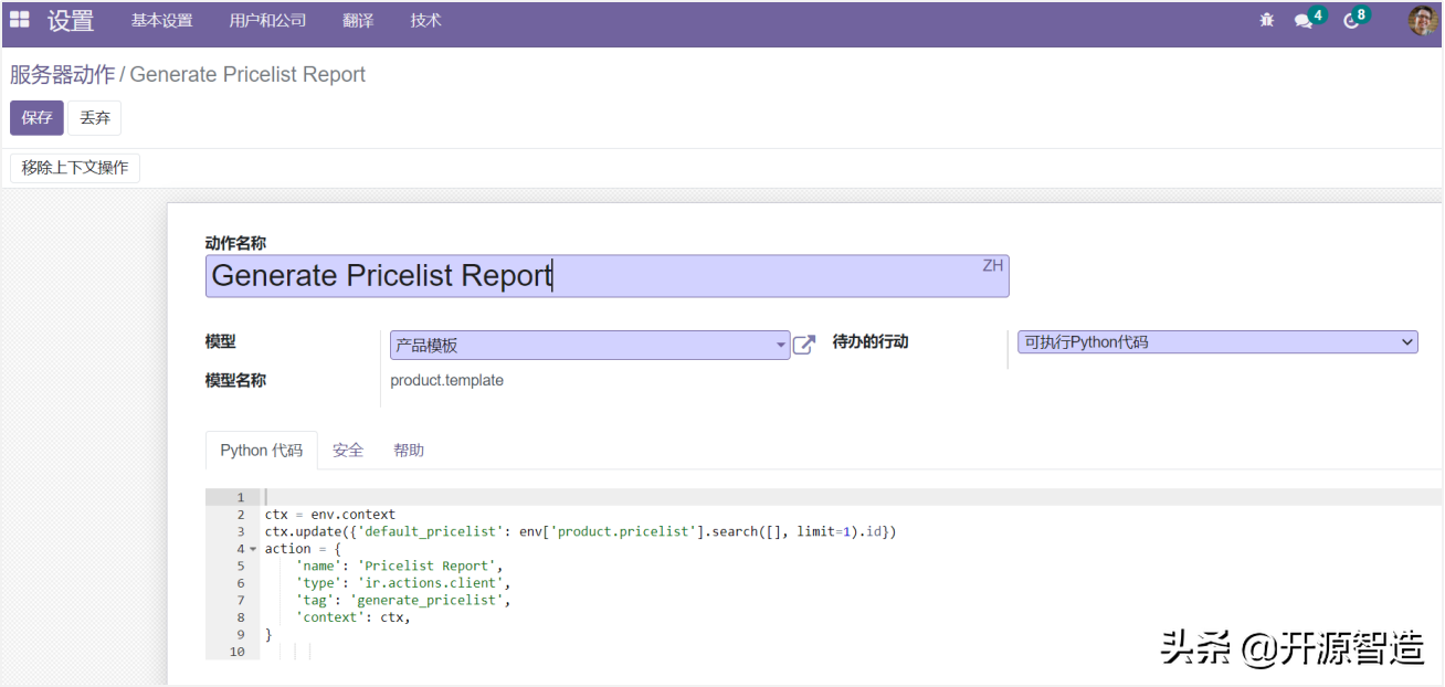 自动动作:可以设置某个动作,当创建或者修改某个单据时候系统自动执行该动作。动作可以是自己编写的python程序,也可以是发送邮件、发送短信等。服务器动作:当点击某个按钮或菜单时候,自动执行指定的动作。动作可以是自己编写的python程序,也可以是发送邮件、发送短信等。计划任务:定期循环执行某个动作。动作可以是自己编写的python程序,也可以是发送邮件、发送短信等。一、自动动作