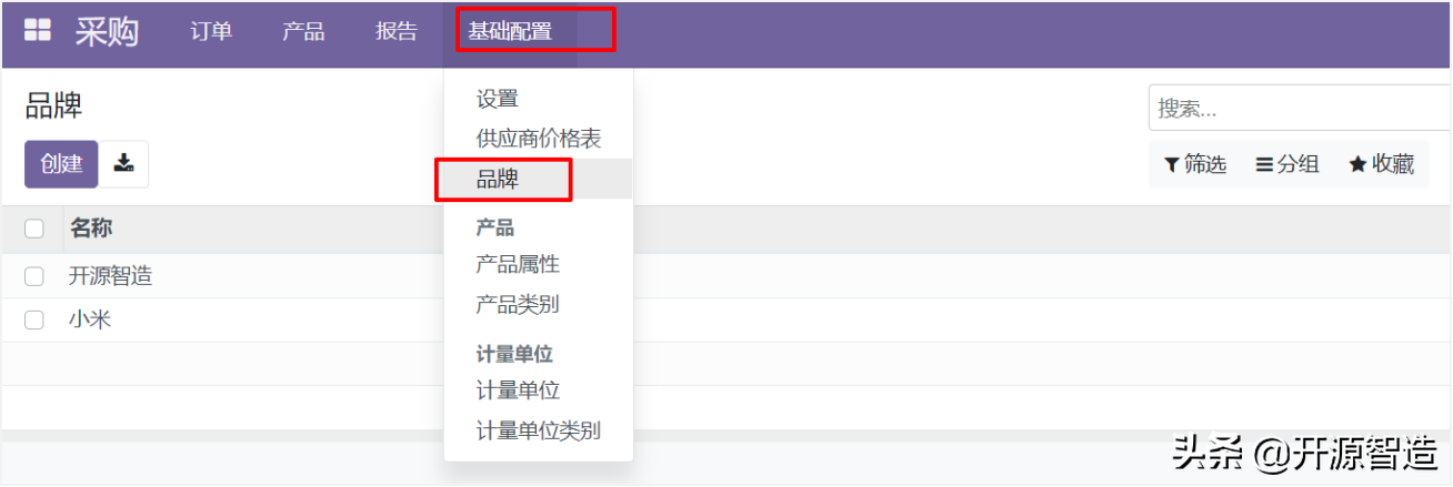 回到采购模块,刷新页面(按F5键),点开“基础配置”菜单,新出现了“品牌”菜单。