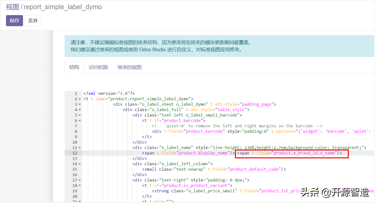 加字段:如Odoo的产品表单,很多行业都有行业特有的一些产品信息,需要在产品上增加更多行业相关字段。加表单:如产品表单上增加了一个品牌字段,还需要增加一个品牌表,用于维护各种品牌,产品上的品牌字段选择品牌,而不是填写品牌。隐藏字段:不需要某些字段,页面上不显示该字段,或者某些字段只有特别权限的人才能看。例如产品表单上的成本字段,只有财务和采购才能看,其他人隐藏起来,不允许看见。修改单据打印格式自动通知:例如,希望系统每天自动以邮件形式,发送仓库中临近保质期的库存列表给仓库主管。自动检查:例如,销售订单提交时候,增加检查逻辑:客户信用额度是否超标了,销售价格是否低于该产品的最低折扣率。Odoo中在线开发工具有两个版本,一个是Odoo企业版的Studio工具,一个是Odoo社区版的在线开发工具。Studio工具增加了可视化开发功能,即在页面上拖拉即可增加字段,修改显示格式,修改单据打印格式。但Studio属于企业版,需要购买授权。本文主要介绍我们开源智造免费开源的社区版的在线开发工具。