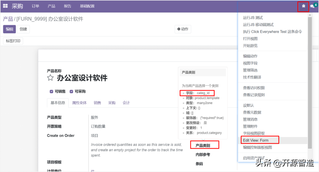 点击右上角的小虫子,点击“Edit View:Form”,打开表单视图编辑页面。找到字段 categ_id,在它后面添加 xml 代码行: