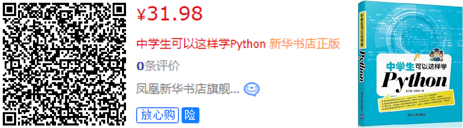 教材:扫描/长按识别下方二维码,在京东上购买,或者在其它电子商城搜索“中学生可以这样学Python”购买视频:本书配套视频我们将列在下方“课程内容”中代码:可以扫描书上二维码,查看参考代码工具课件视频:公众号回复“中学生可以这样学Python”,获取下载地址