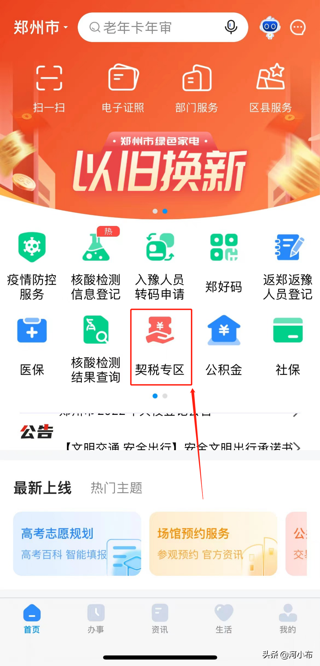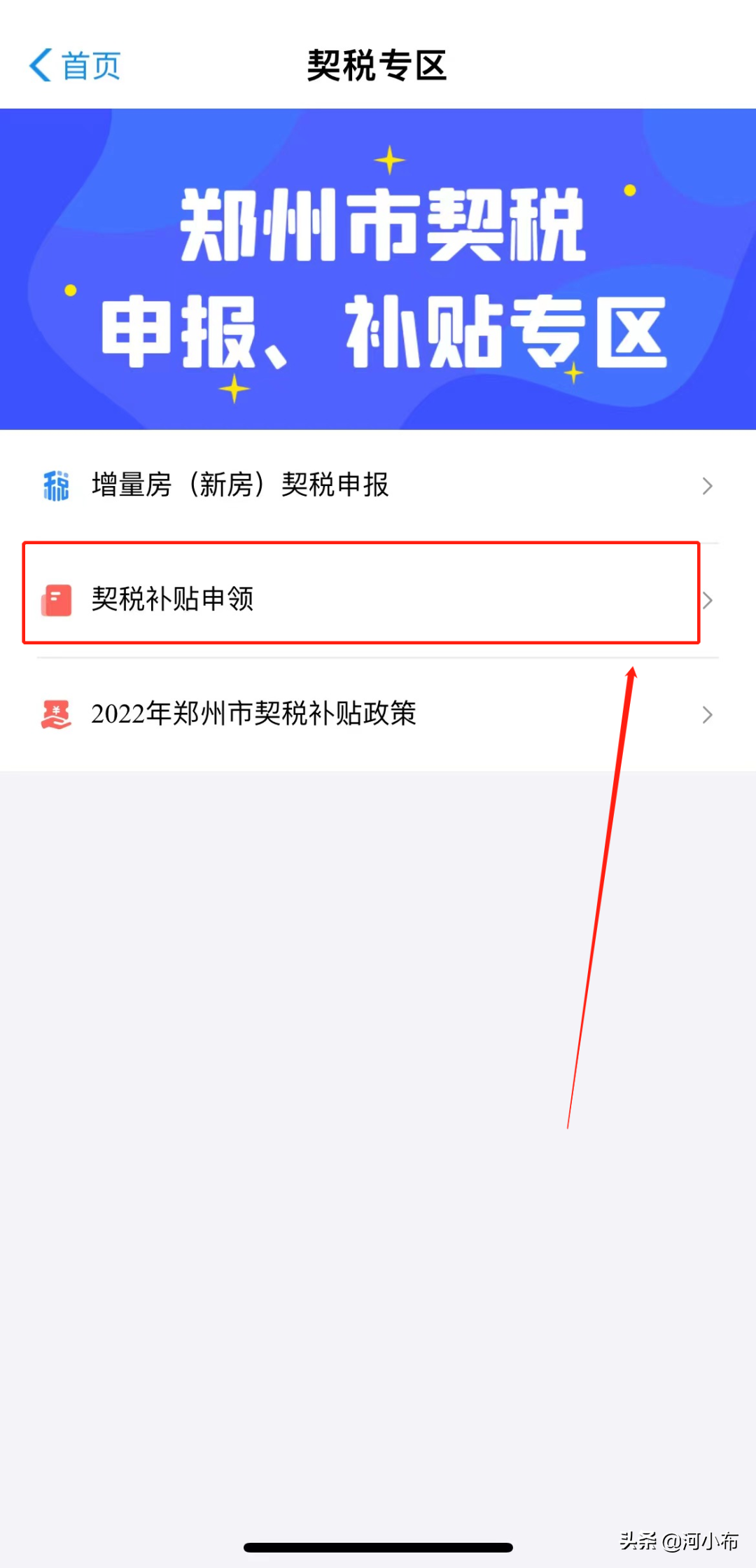 第一步:进入在“郑好办”APP,点击首页“契税专区”,选择“契税补贴申领”