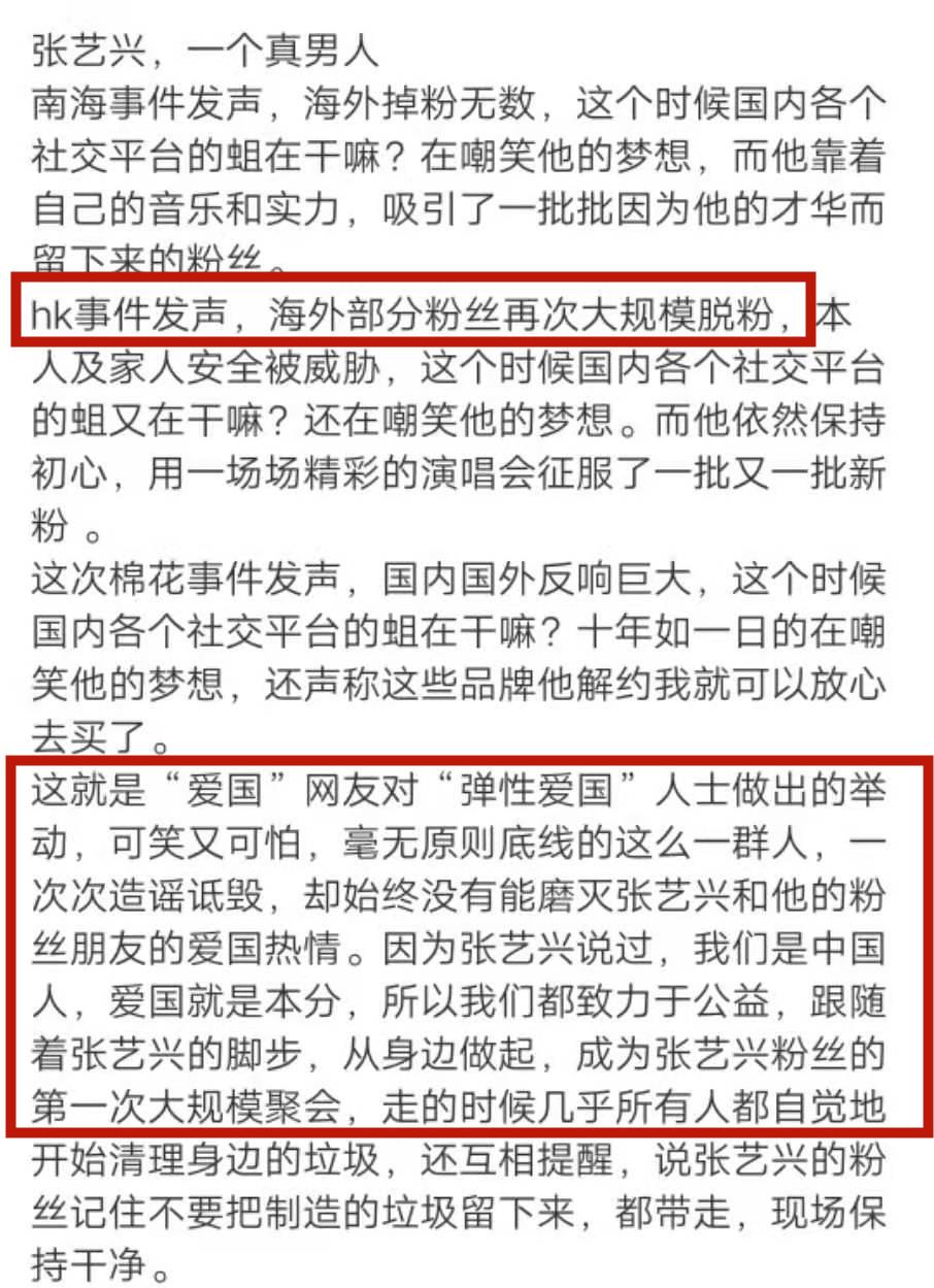 即使张艺兴如何用行动证明一切,却仍然遭受激烈的网络暴力。因为一些网友的恶意攻击,“弹性爱国”一词再次与张艺兴产生联系。