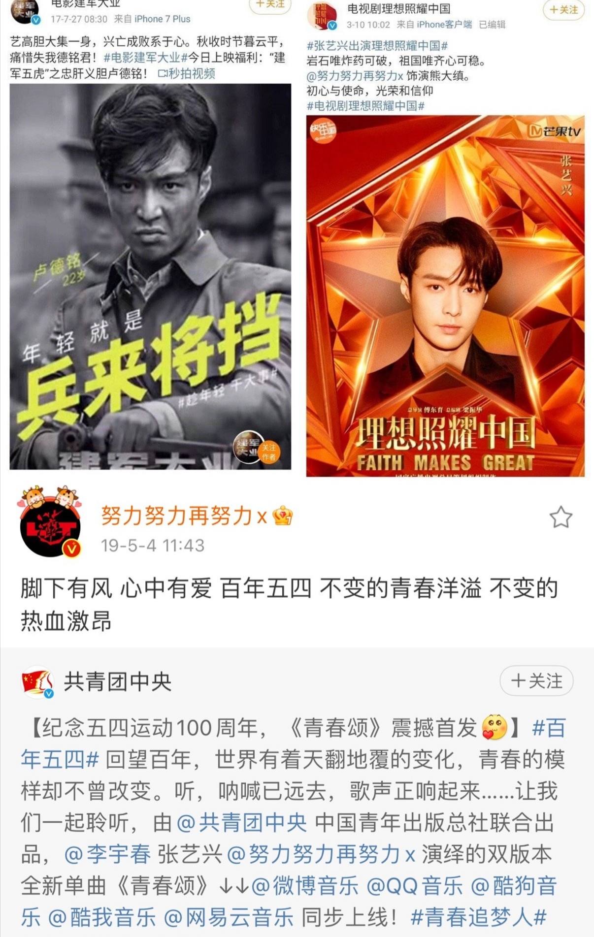 张艺兴还参加过中央共青团牵头歌曲《青春颂》。