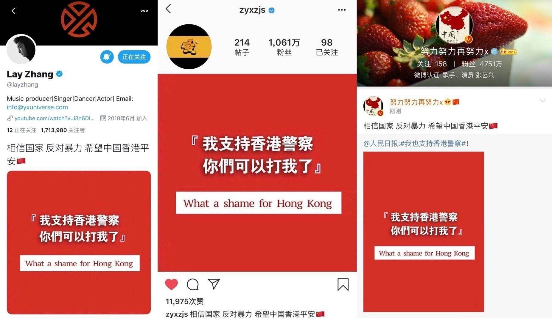 在2019年8月,张艺兴也正面支持香港警察,并且是中国第一个在三个平台上公开发布支持香港警察言论。