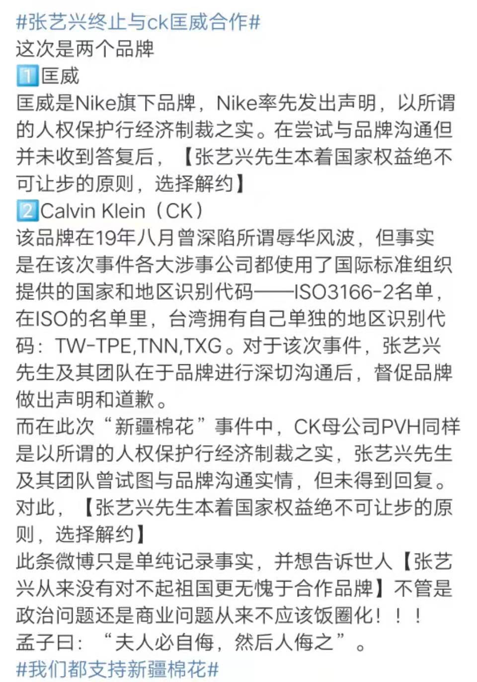 而在3月25日的事件中,发布的棉花名单上其实并没有CK,但是张艺兴第一时间选择了自查。