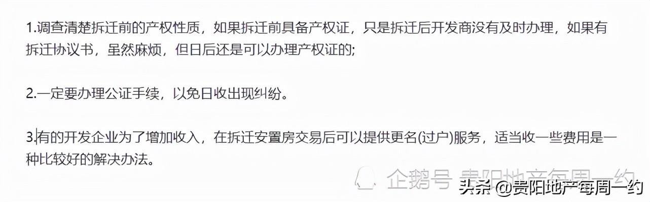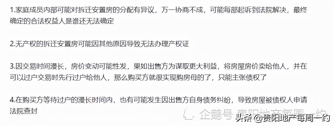 市面上挂牌的拆迁安置房,很多是没有取得产证,或者是刚刚取得产证,是按照规定5年内限制转让的房子,安置房买卖的风险很大,甚至没有保障。