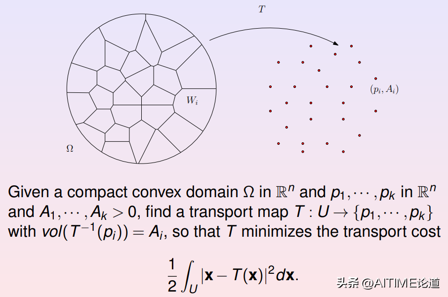 假设源概率分布为单位圆盘内的勒贝格测度,目标概率分布为离散的分布。求解最优传输映射等价于对单位圆盘进行胞腔分解,每个胞腔映射到一个目标采样点,使得胞腔的面积等于这个采样点对应的权重。我们在所有这样的胞腔分解之寻找总传输代价最少者。根据Brenier定理,这个半离散最优传输映射应该等于某个凸函数的梯度映射。