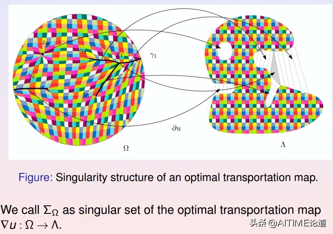 模式坍塌现象的本质原因来自于最优传输映射的正则性理论。在经典的蒙日-安培方程理论中,人们研究最优传输映射大多是比较规则的情形,假设密度函数上下有界,支集是边界光滑的凸集,由此我们能够证明解的光滑性。但是如果目标区域非凸,则解可能非光滑,存在奇异集合。例如上届菲尔兹奖得主Figalli给出下面的例子: