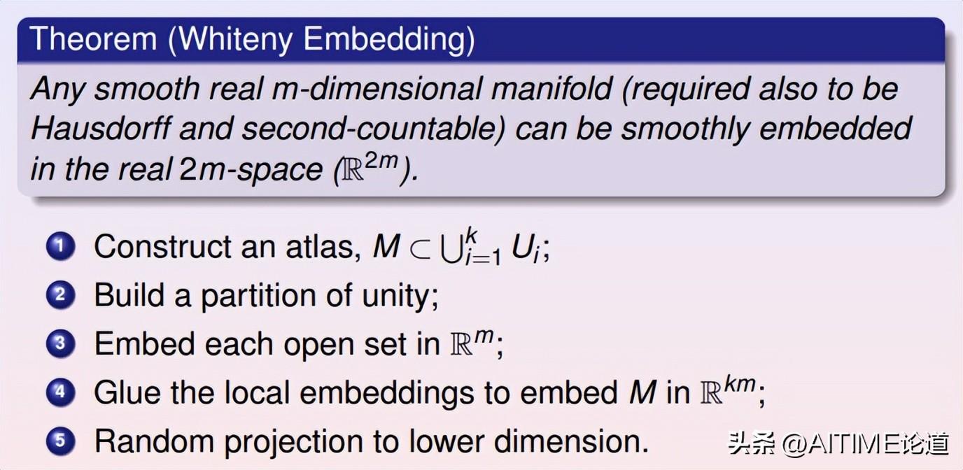 Whitney流形定理是说任意给一个m维拓扑流形,我们可以将其嵌入在欧式空间中,欧氏空间的维数大约是流形维数的两倍。现在很多深度学习的算法本质上就是Whitney定理的实现。Whitney定理的证明需要先用一族开集覆盖流形,将每个开集嵌入到欧氏空间,然后用所谓的单位分解把局部嵌入整体粘起来得到一个全局嵌入。这时嵌入空间的维数等于流形的维数乘以开集的个数,我们在将嵌入的流形依次向低维线性子空间投影,直至无法进一步投影,这时子空间的维数等于流形维数的两倍。