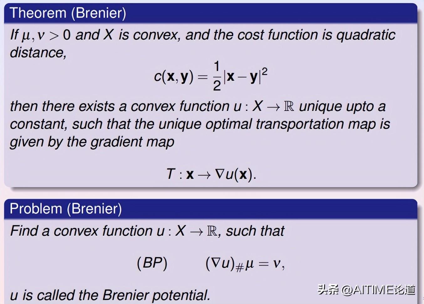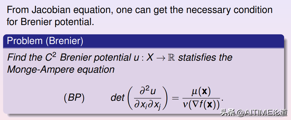 最优传输映射是在所有供需平衡的映射中是的总传输代价最小者。Brenier定理断言:如果传输代价是由从供给方到需求方的欧氏距离平方来界定,那么这个最优方案就会由一个凸函数的梯度给出,这个函数就被称为Brenier势能函数,且满足知名的Monge-Ampere方程。