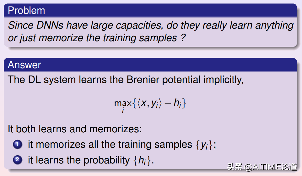 由此我们看到深度学习算法学习的Brenier势能函数的表达式包含两部分,一部分是所有样本,所有深度学习神经网络记住了所有样本;一部分是每个支撑平面的截距,这是算法提炼出来的内在知识。由此我们看到所以深度神经网络的确确实记住了所有的训练样本,而且学会了一些新的知识。