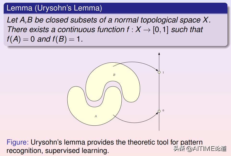 我们进行模式识别的时候,每一类数据样本其实都是高维空间中的点云,不同类样本是不同的团簇,两个团簇可以用两个闭集覆盖。上述Urysohn定理表明了所需识别映射的存在性:即在一般的拓扑空间里肯定能找到一个连续映射,把第一个闭集映射成0,把第二个闭集映射成1。对于分类判别器而言,算法的核心就是求解这个映射。