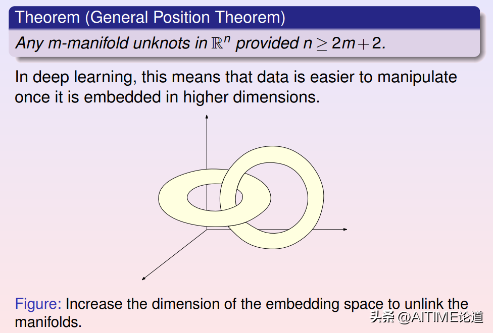 考虑流形在欧氏空间中的嵌入,一般位置定理断言如果欧氏空间的维数足够高,那么流形的嵌入可以将扭结打开使其不再自我嵌套。因此,在深度网络模型中,前面几层的宽度逐步增加,从而提高嵌入空间的维数。