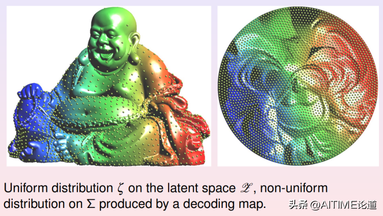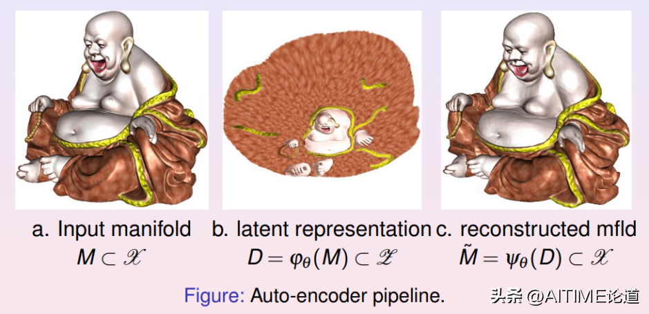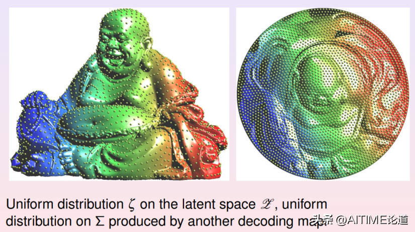 我们这里举一个简单的例子,我们用自动编码器学习弥勒佛曲面的拓扑结构。我们在曲面上均匀采样,将3000个采样点作为自动编码器的输入。编码映射将曲面展平到二维平面上,解码映射将平面像映回到三维空间。我们看到重建的曲面和初始曲面非常接近,所有精细的几何细节都被完美保持。这证明了编码解码映射实现了拓扑同胚。