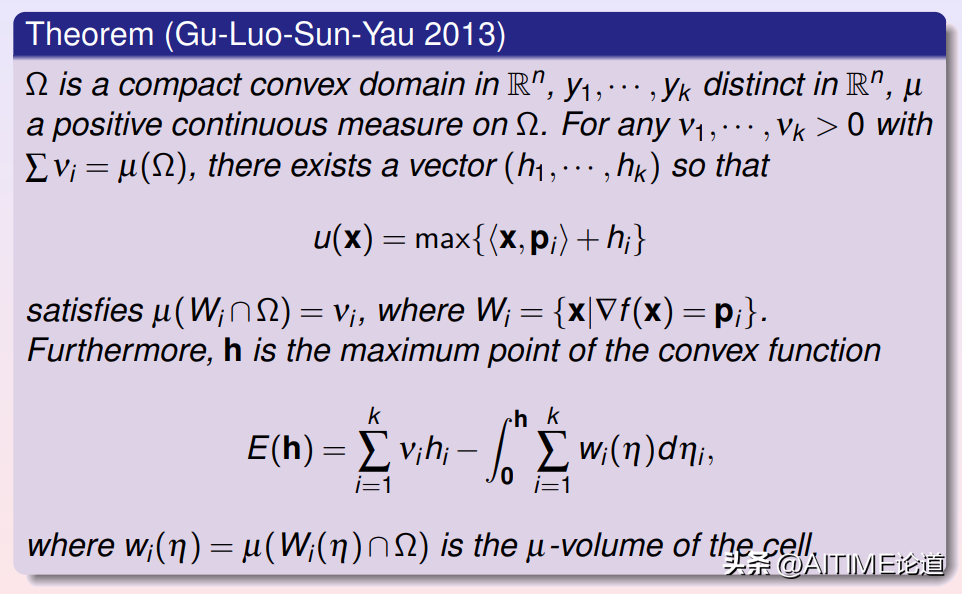 (4)概率论中的Brenier理论和微分几何中的Minkowski-Alexandroff理论等价,从而可以从几何角度来解释概率统计,用几何变分法来求解最优传输映射。