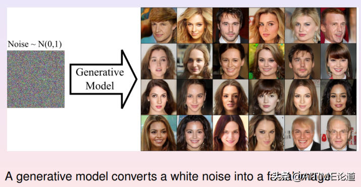 我们在特征空间生成一个白噪声,均匀分布或者高斯分布,然后将其变换成特征空间中的数据分布。这样我们可以在特征空间产生随机采样点,其分布符合数据分布,在将隐空间的随机采样带映射回数据流形上,得到数据流形上的一个采样点,即为随机生成的人脸图像。