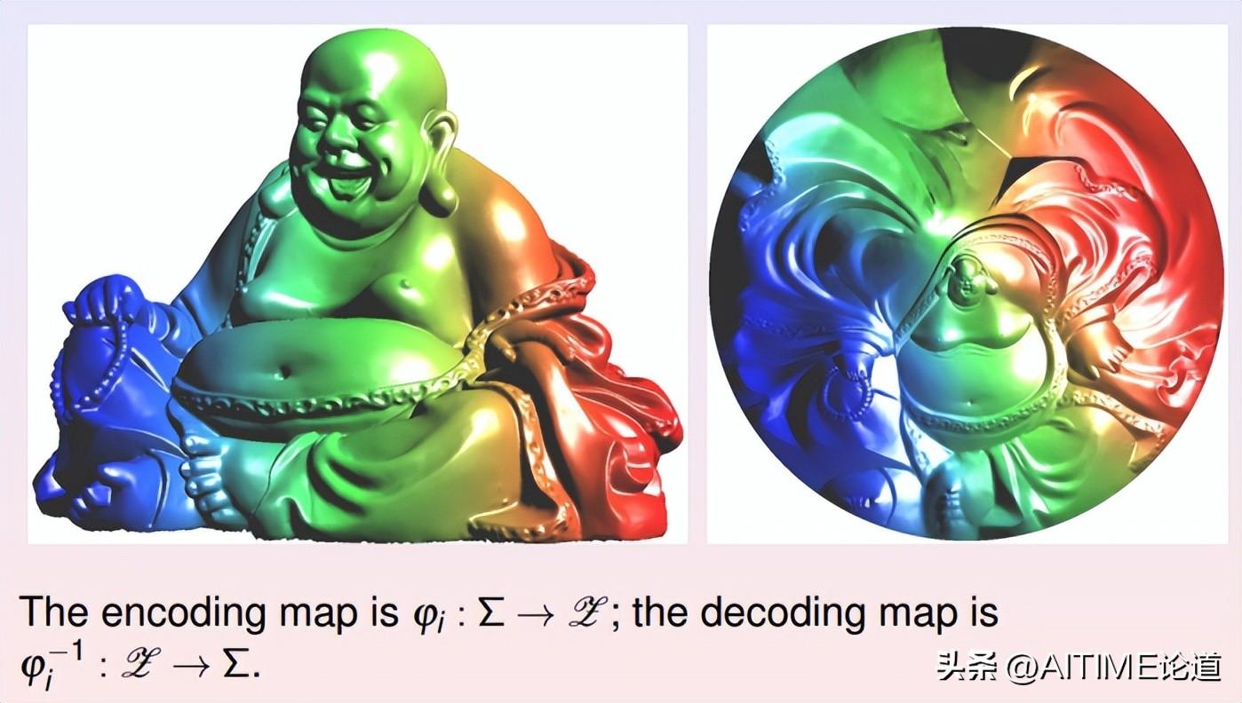 降维的过程被称为编码,逆过程被称为解码。这里我们显示了两种编码映射,它们都将弥勒佛曲面映到平面单位圆盘上。第一种是基于黎曼映照的保角变换,第二种是基于最优传输的保面元映射。