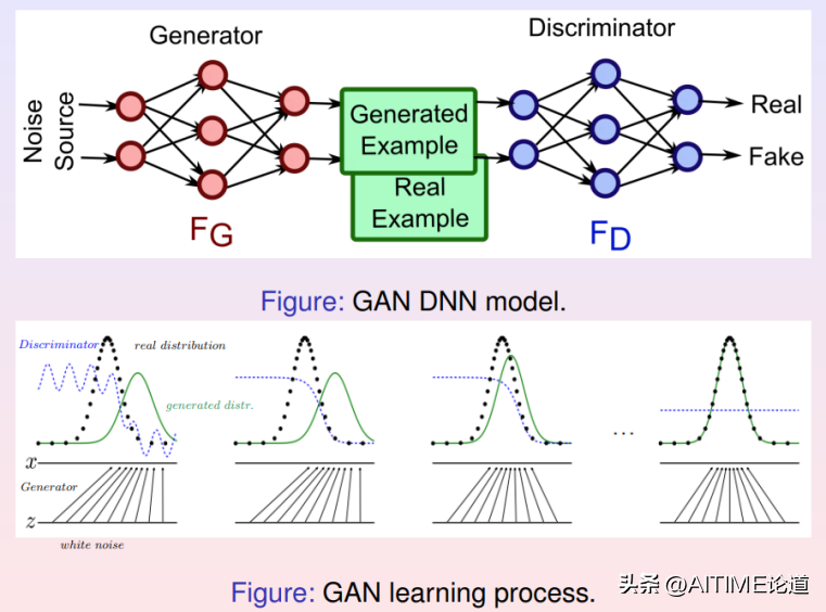 生成器Generator生成虚假的数据分布,判别器Discriminator要识别分布是真是假。那么用数学语言就是说,我们在特征空间有个白噪声分布,生成器将特征空间的白噪声分布变换成数据流形上的生成分布。图中数据流形上的生成分布是绿色曲线,数据流形上的真实分布是虚线。判别器判别两个分布的相异程度,生成器优化生成分布,使之尽量接近真实分布。两者相互竞争,最终系统达到平衡。