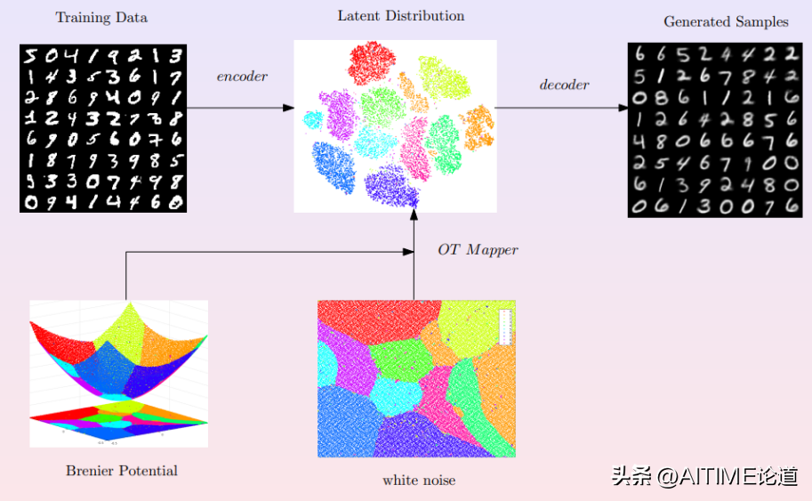 我们知道有很多的生成模型,这些模型的框架如图所示,上面一行显示了学习流形结构的过程,下面一行是学习概率分布的过程。在上行中,编码映射将手写体数字流形映射到特征空间,将流形上的概率分布映射到隐空间上的概率分布;解码映射将隐空间映回数据流形。在下行中,最优传输映射将长方形内的均匀分布映射到隐空间中的数据分布,这里最优传输映射是某一凸函数的梯度映射,此凸函数被称为是Brenier势能。